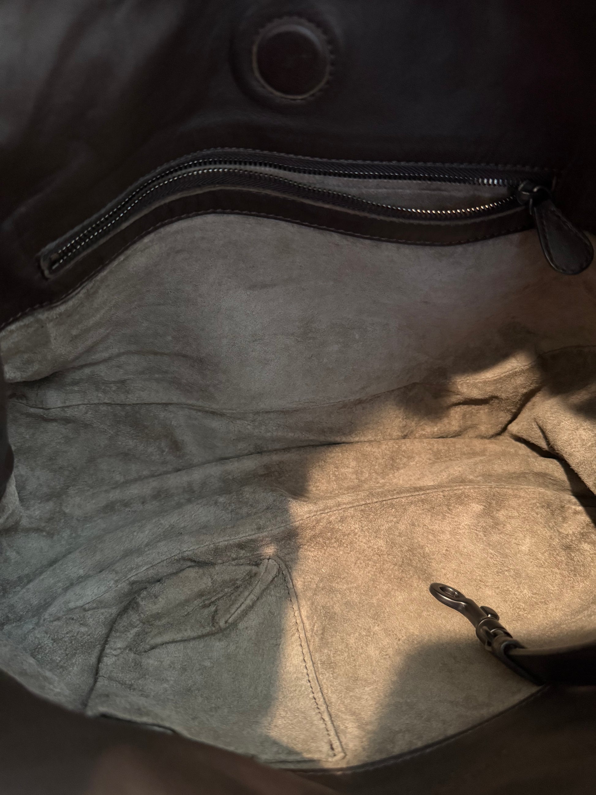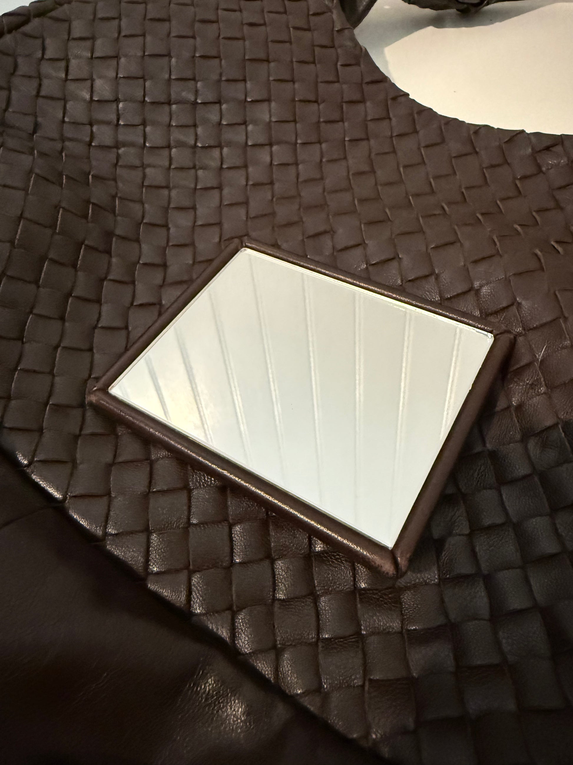 This is a Bottega Veneta Brown featuring the signature Bottega style in leather. The interior is part leather and suede, and features a big zipper pocket and another smaller pocket. It also includes a Bottega mirror. This bag size can fit Phone, iPad, card holder, wallet, lipstick, keys, and other small necessities.