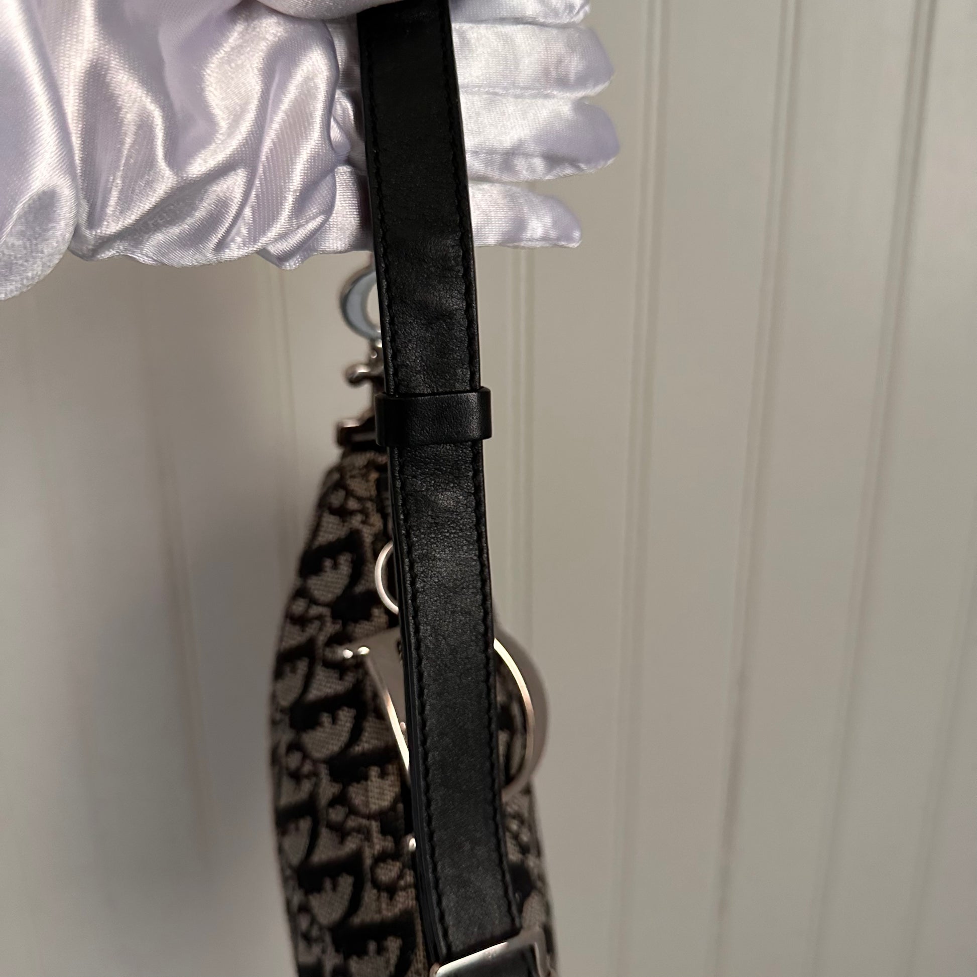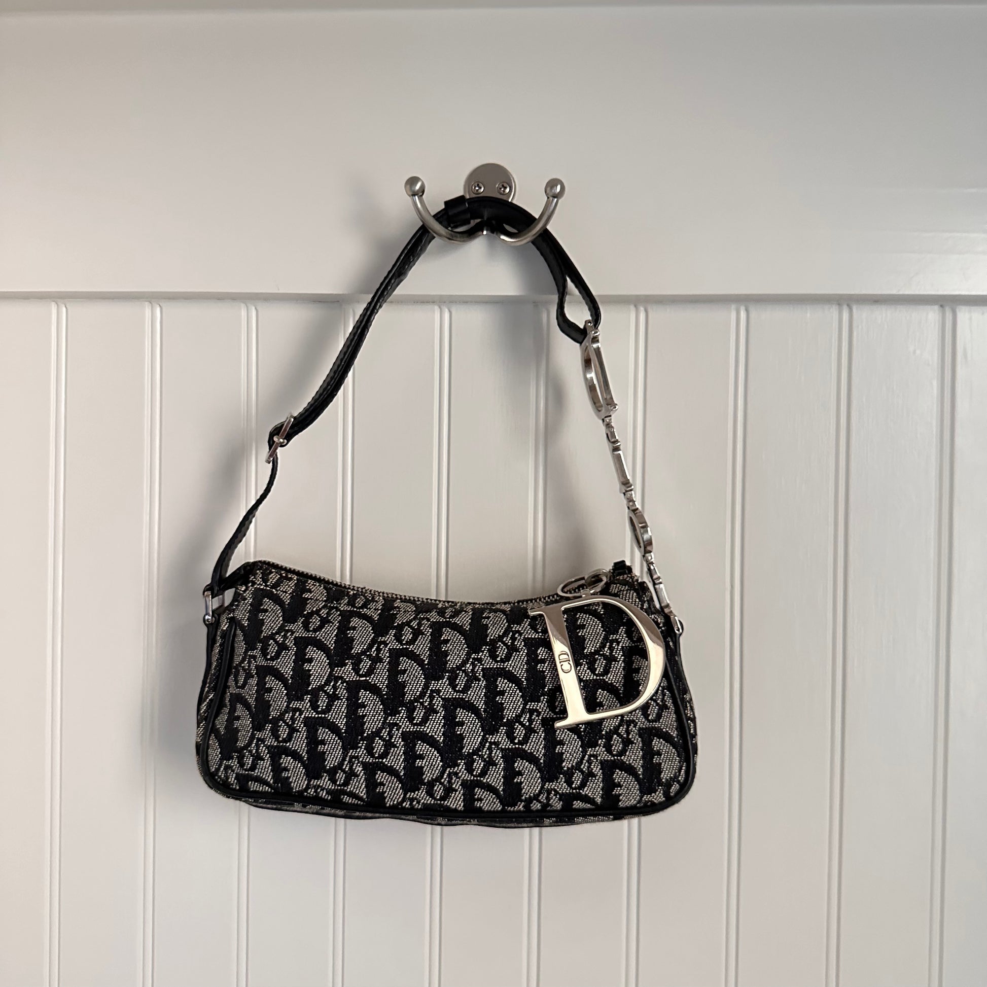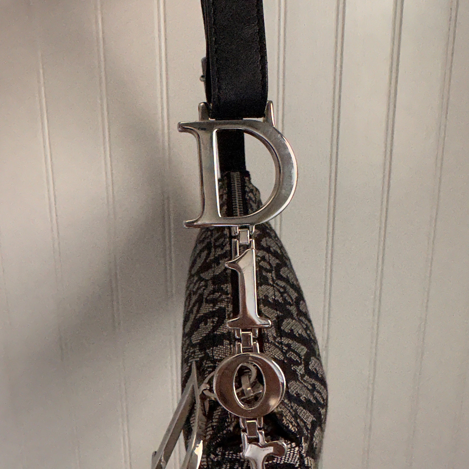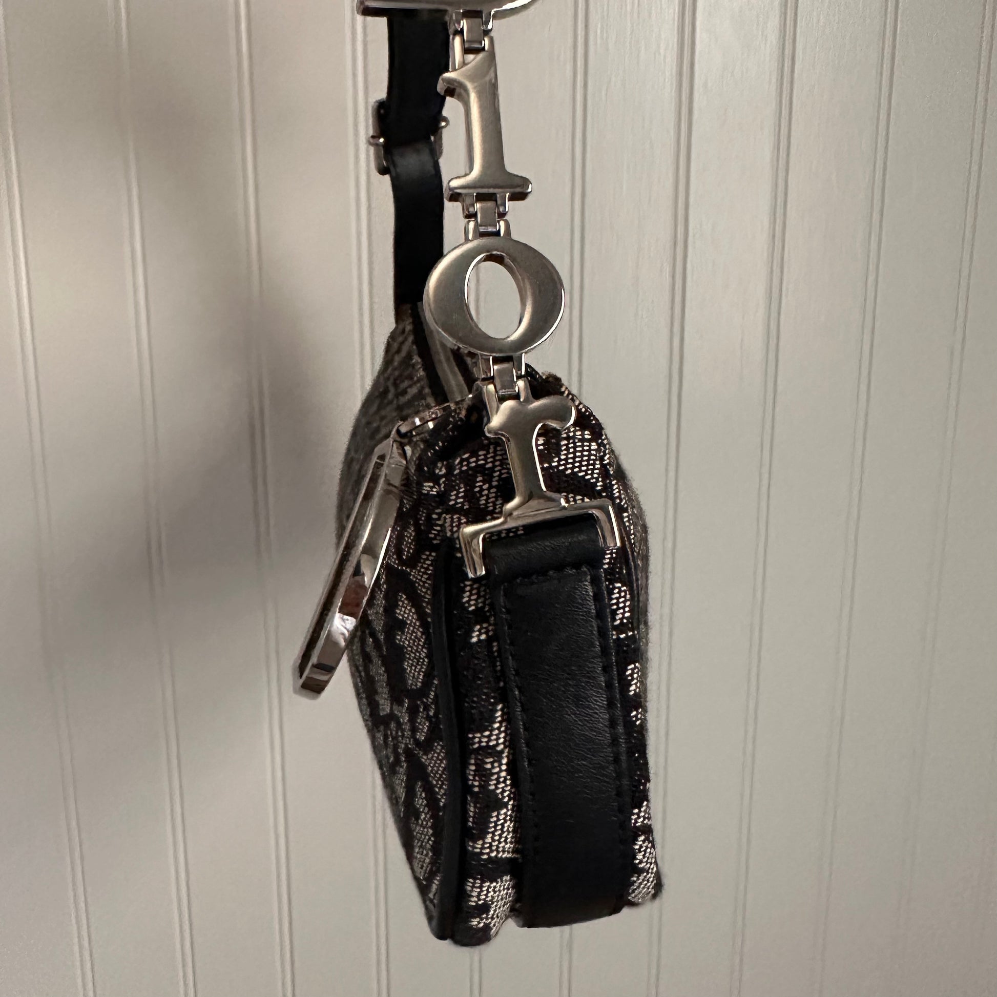 This Christian Dior Monogram Shoulder Bag in Black is crafted with a monogram canvas in black and white tones, complemented by a sleek black leather handle and silver-tone hardware. The black nylon interior includes a flat pocket. This bag can carry a phone, card holder, long wallet, keys, lipstick, and other small essentials.