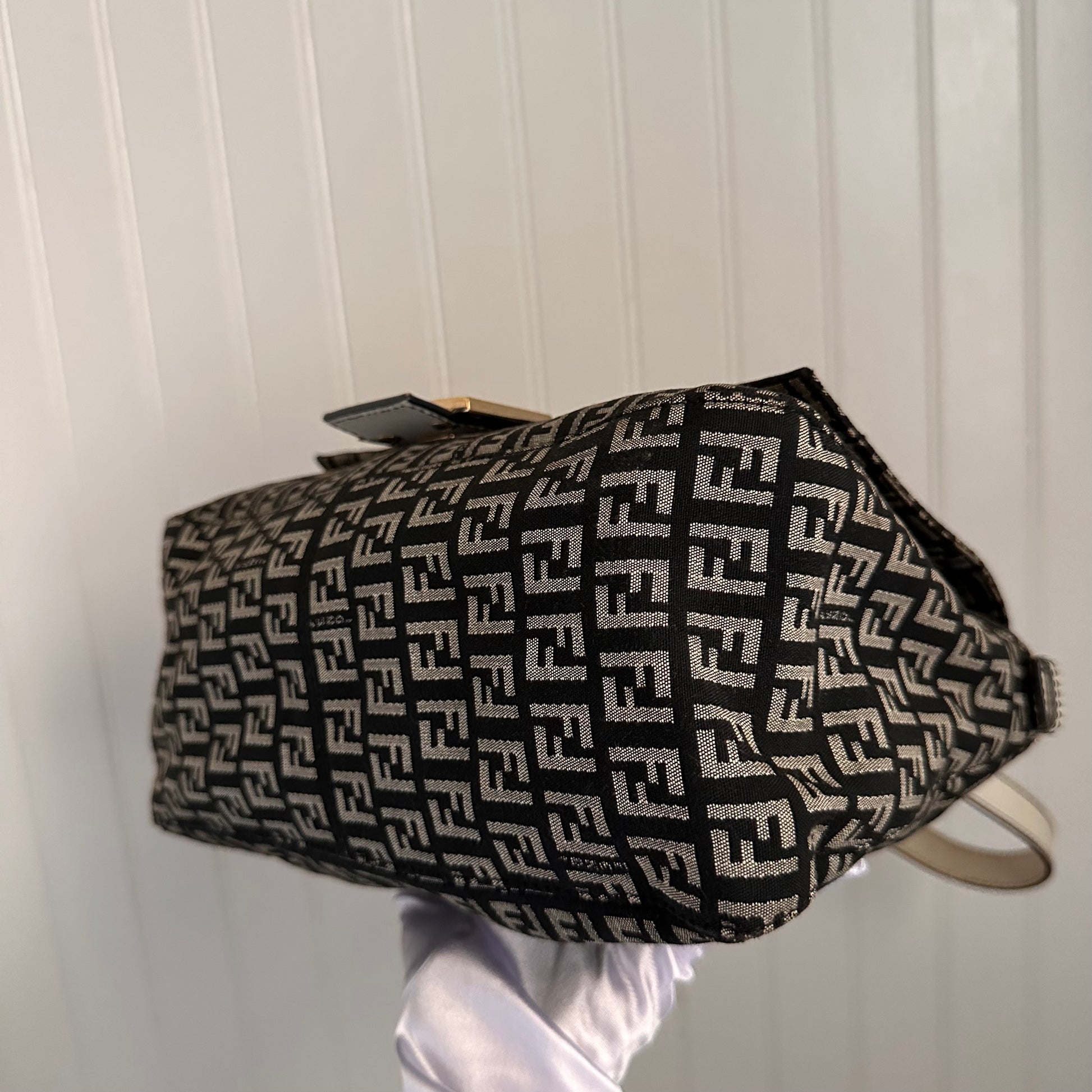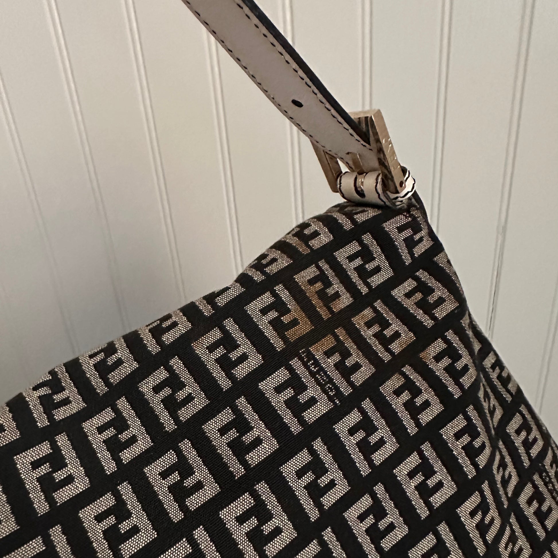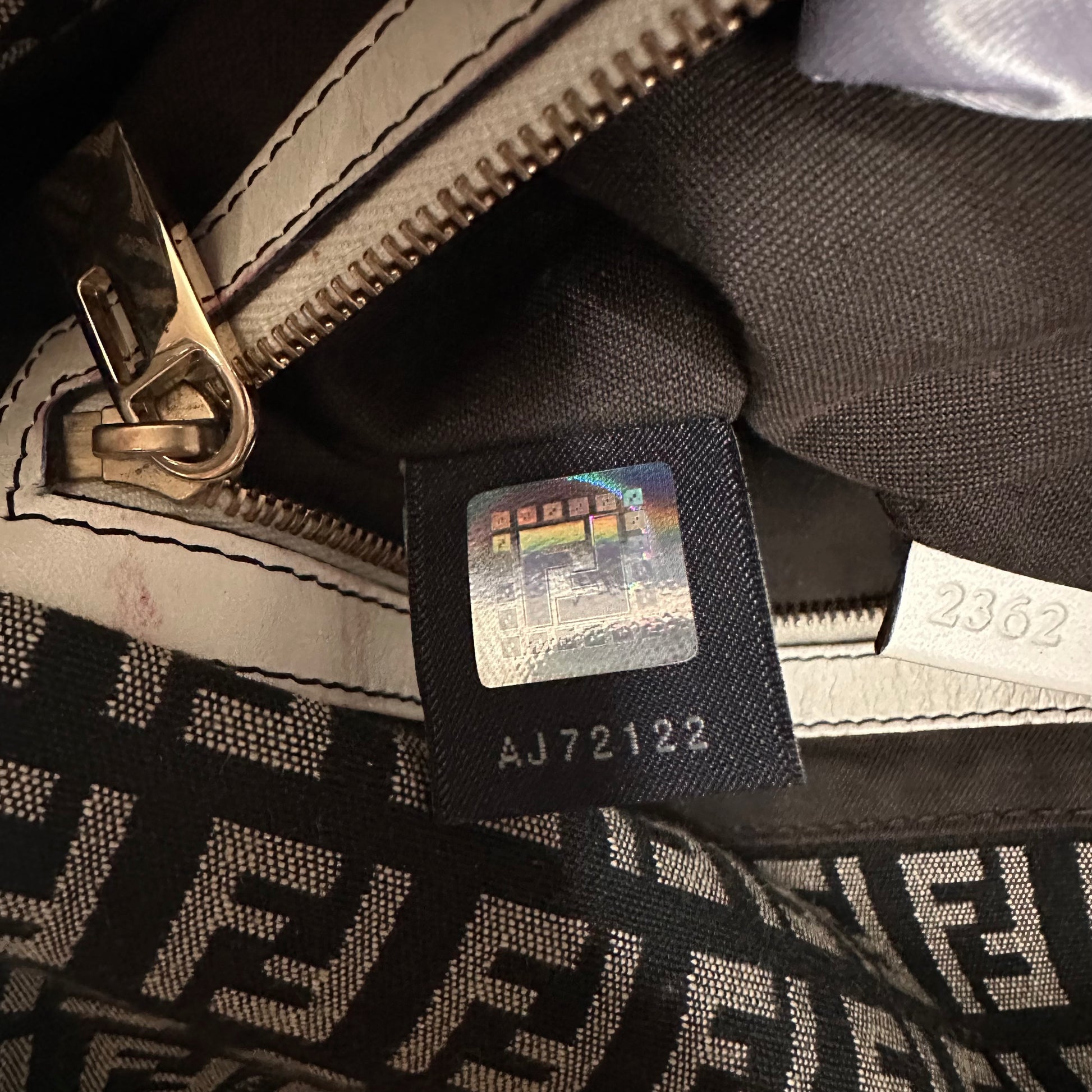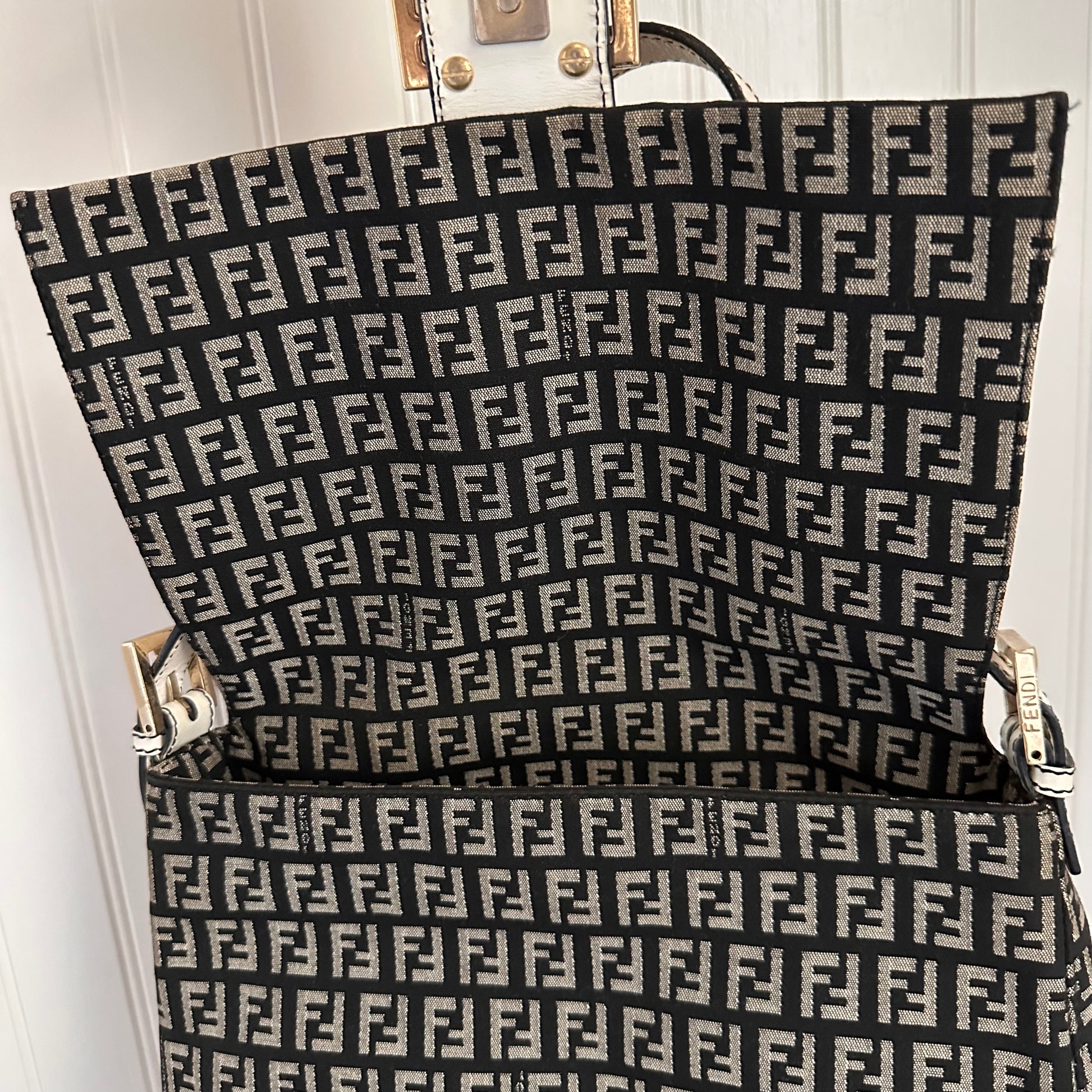 This Fendi Mama Monogram Canvas showcases the iconic Fendi Monogram on its durable canvas, complemented by a white leather strap and gold-toned hardware. The interior features white leather pockets accented by brown cloth for a stylish yet functional design.