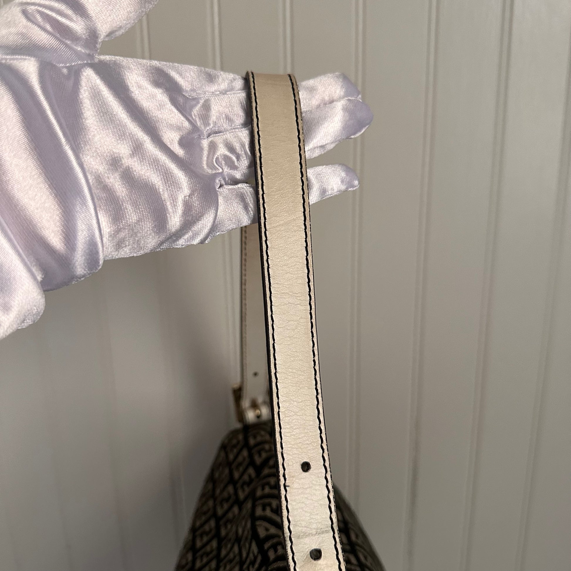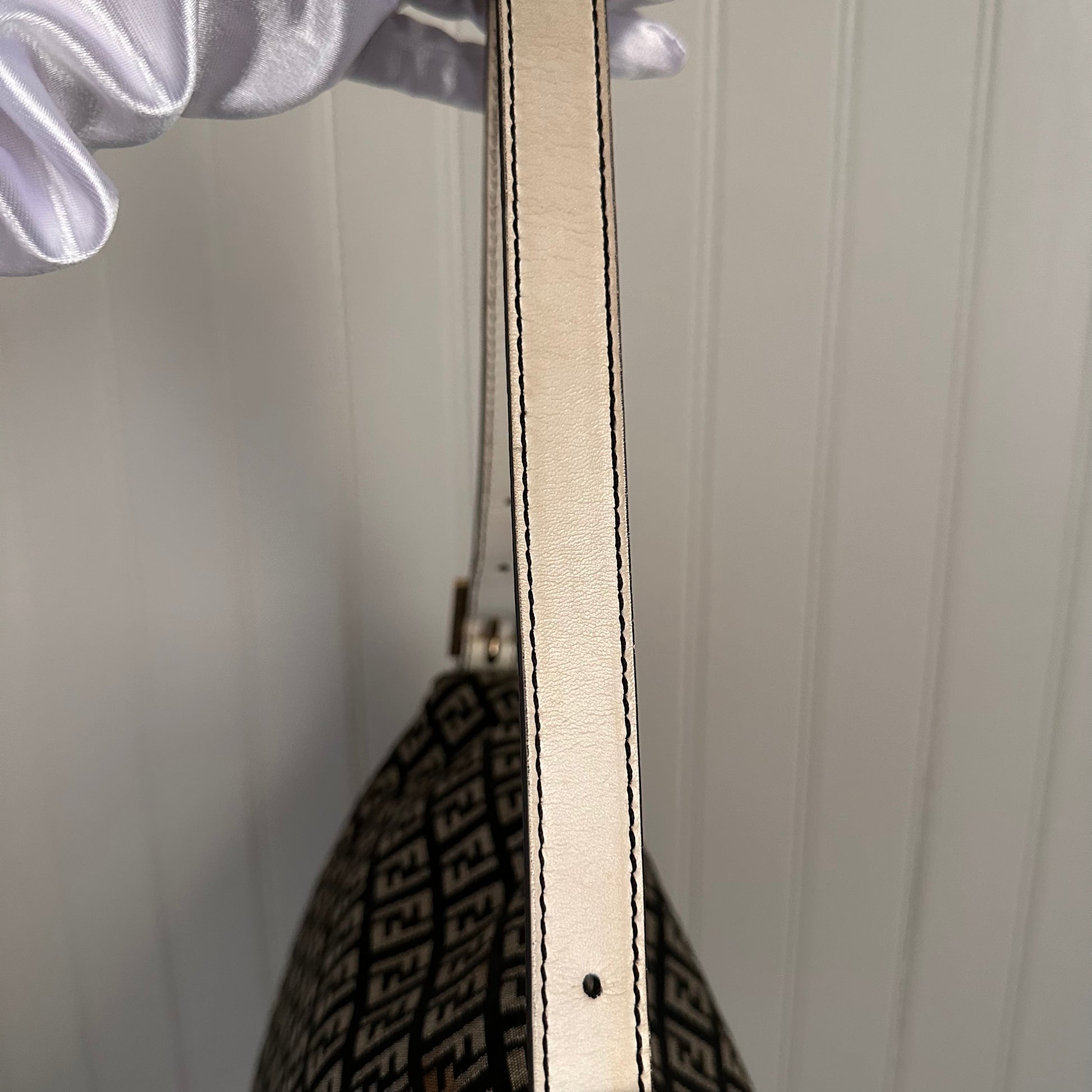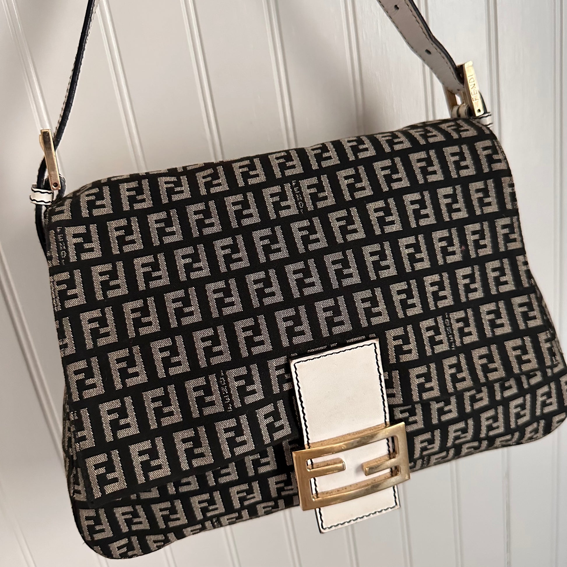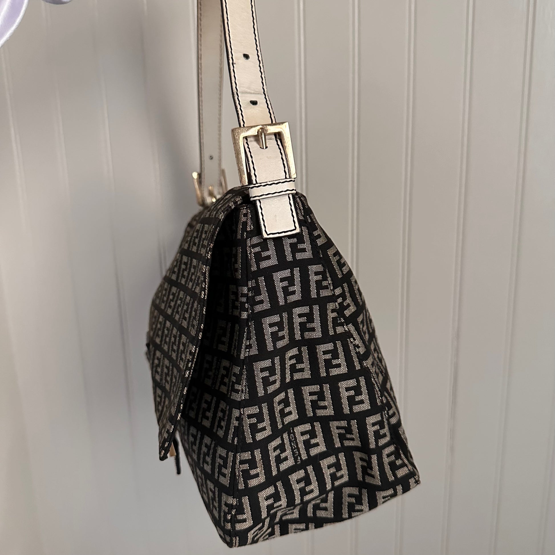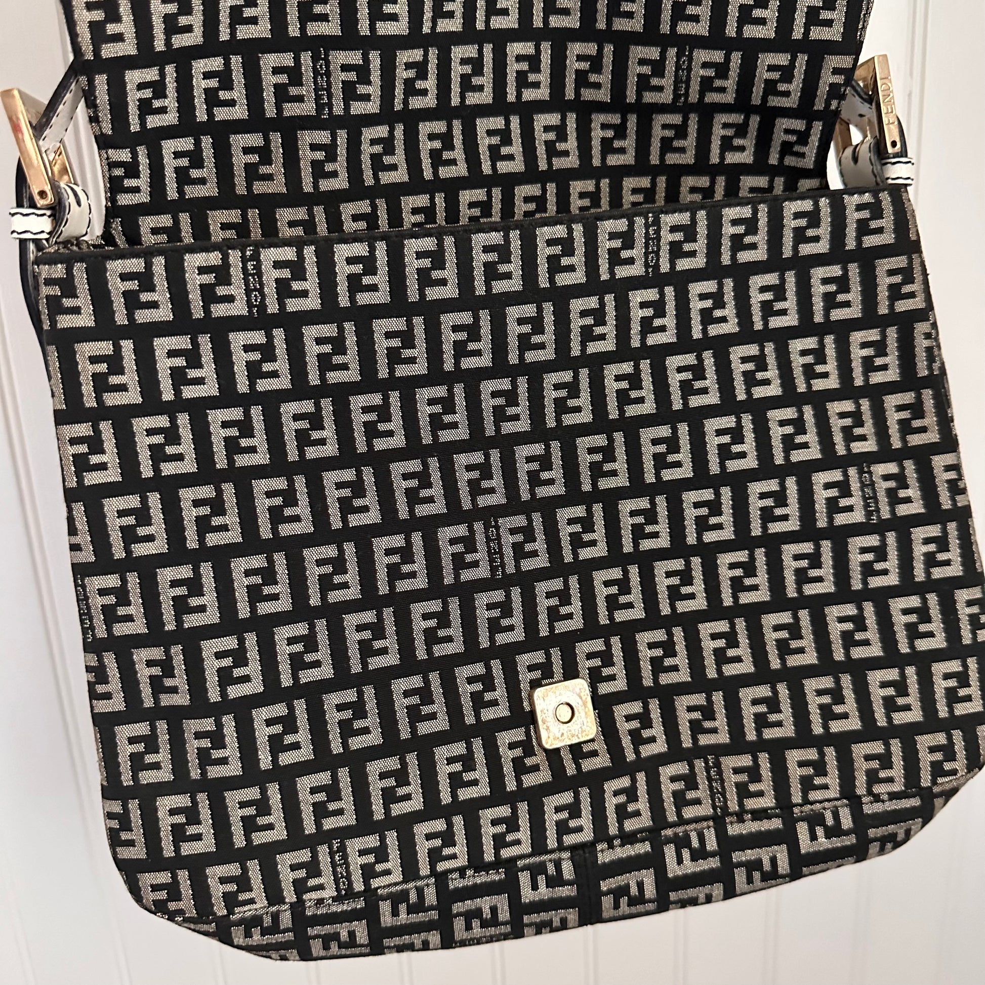 This Fendi Mama Monogram Canvas showcases the iconic Fendi Monogram on its durable canvas, complemented by a white leather strap and gold-toned hardware. The interior features white leather pockets accented by brown cloth for a stylish yet functional design.