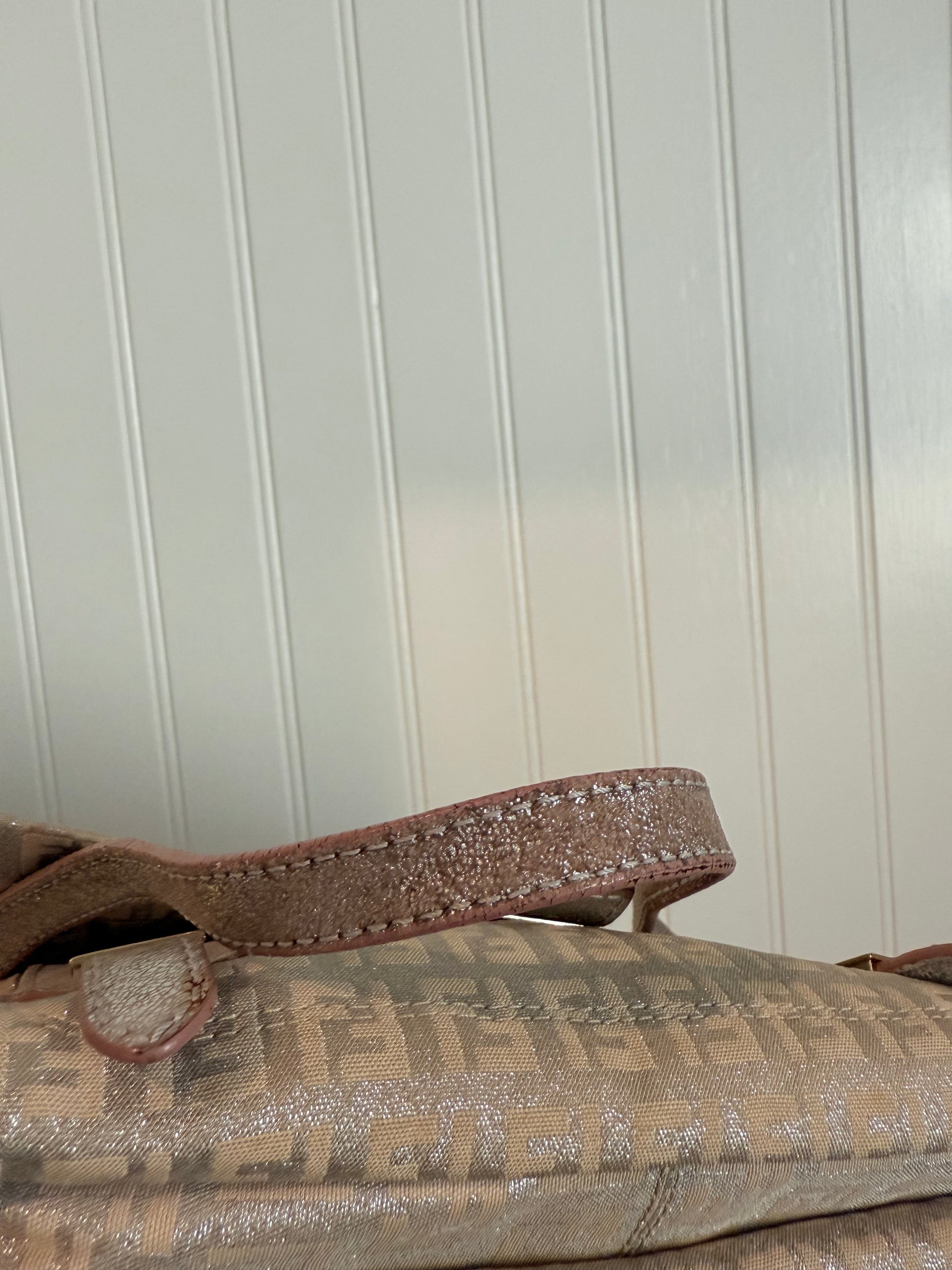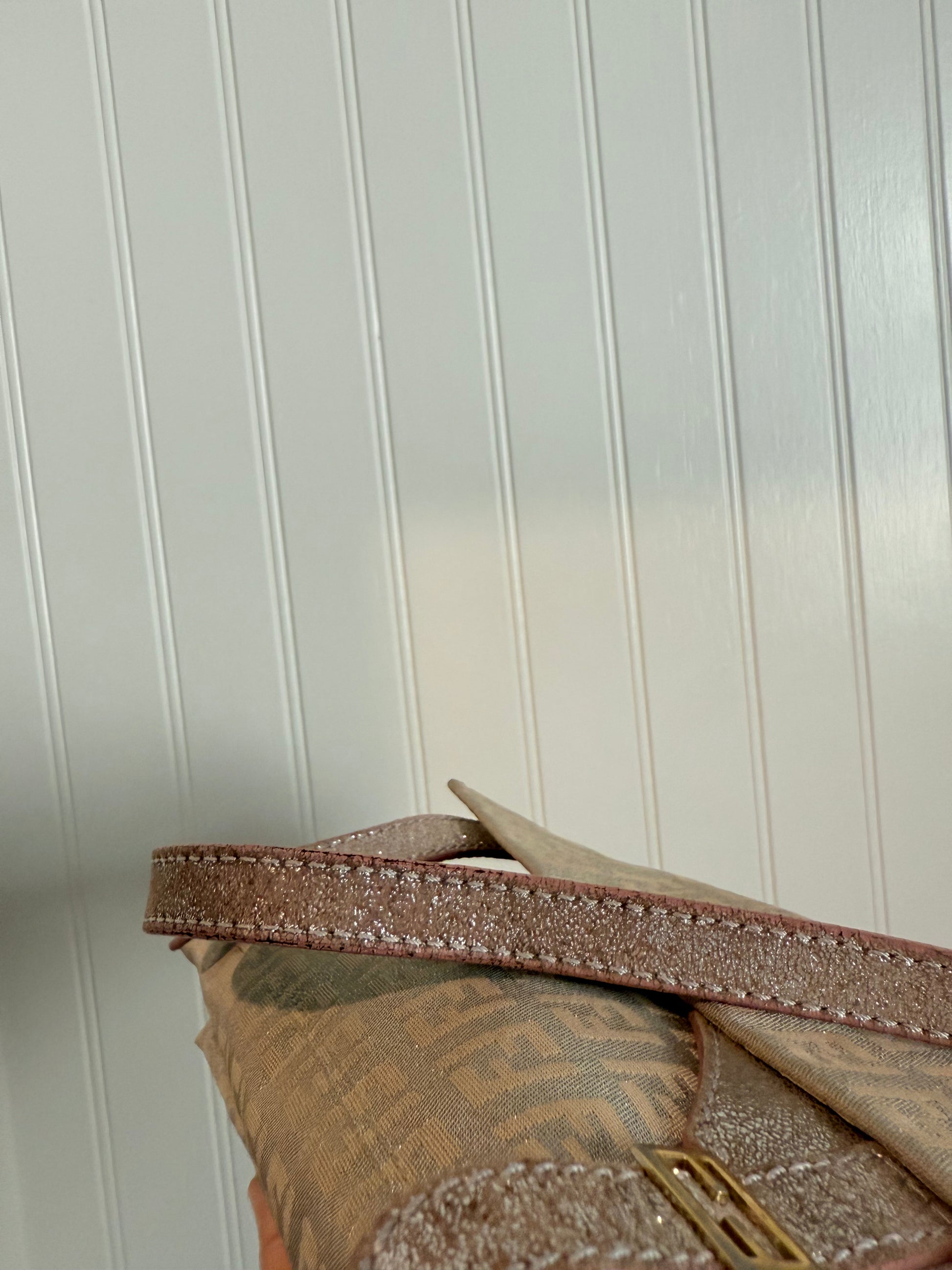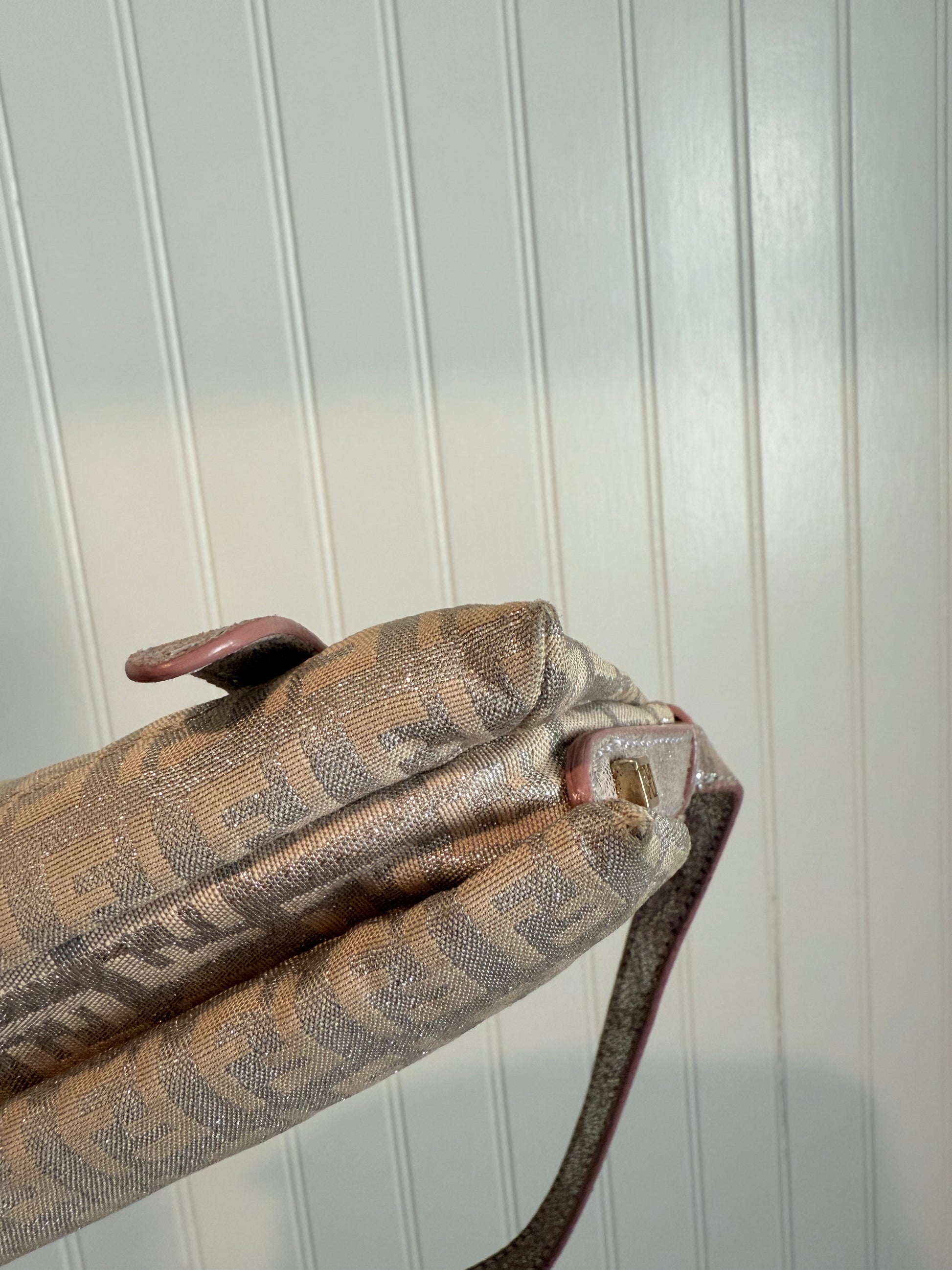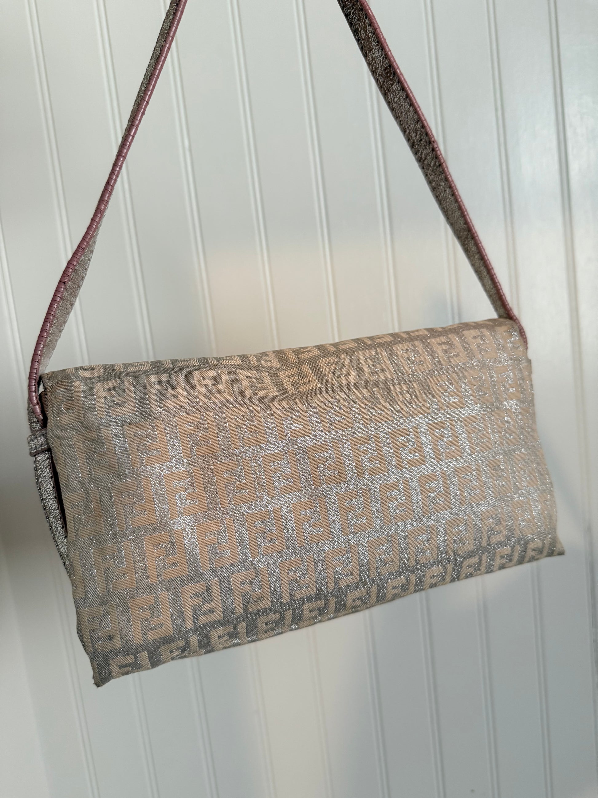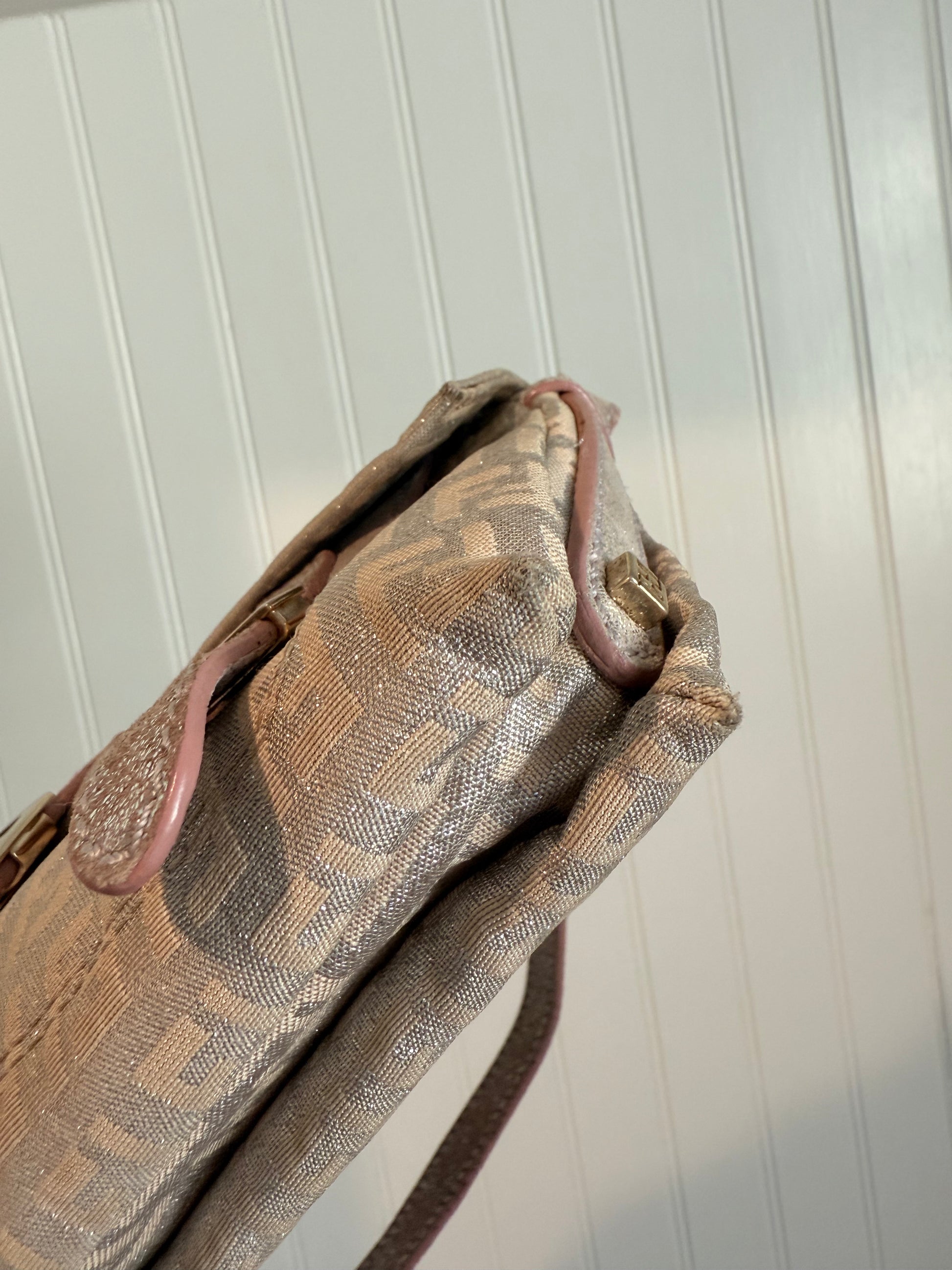 This FENDI shoulder bag is so cute with it's glitter monogram design in pink. IT features a very convienient double pocket, with silver-tone hardware. The inside is pink with a small pocket. Can Fit Phone, card holder, short wallet, lipstick, keys, and other small necessities.