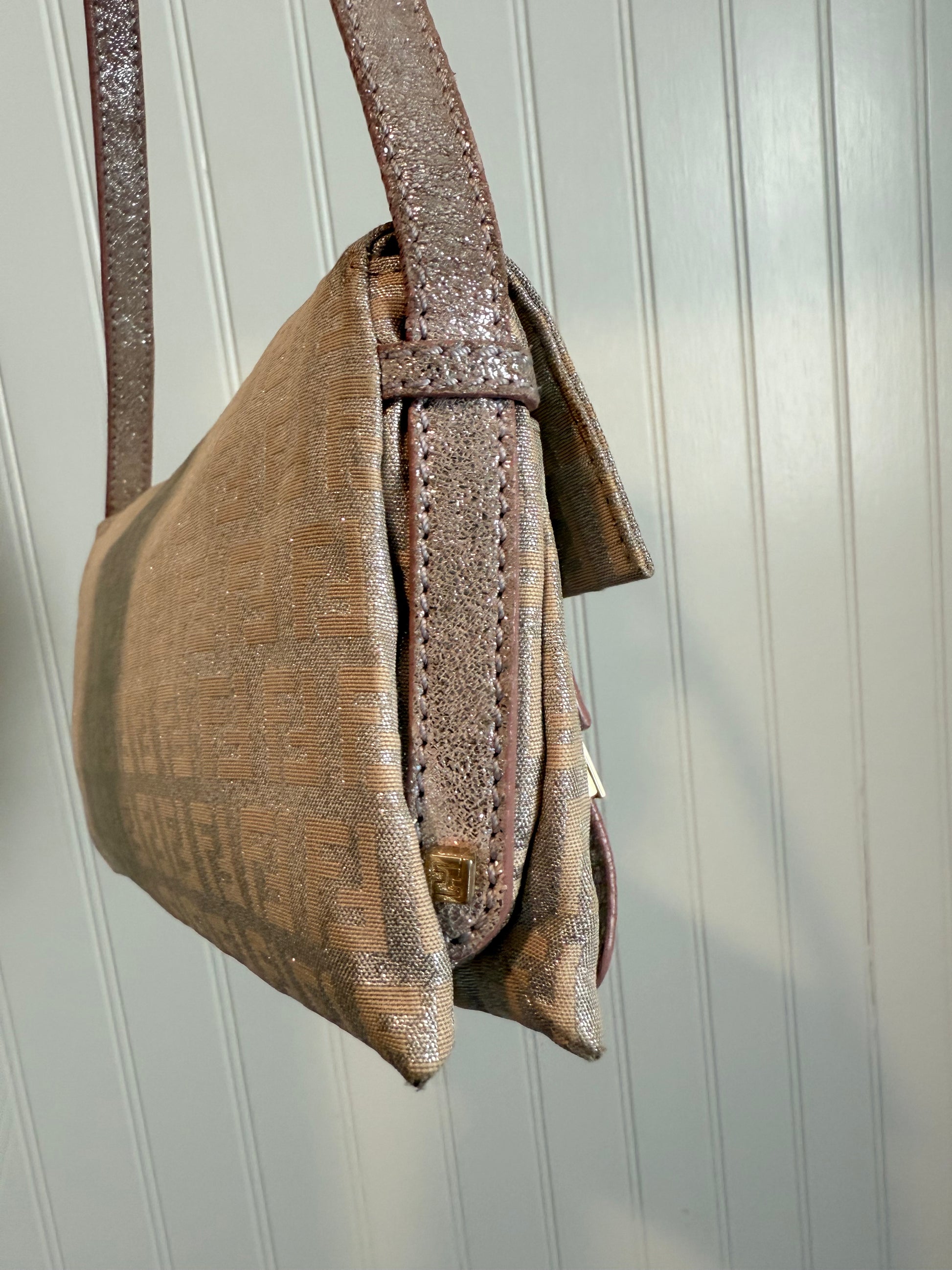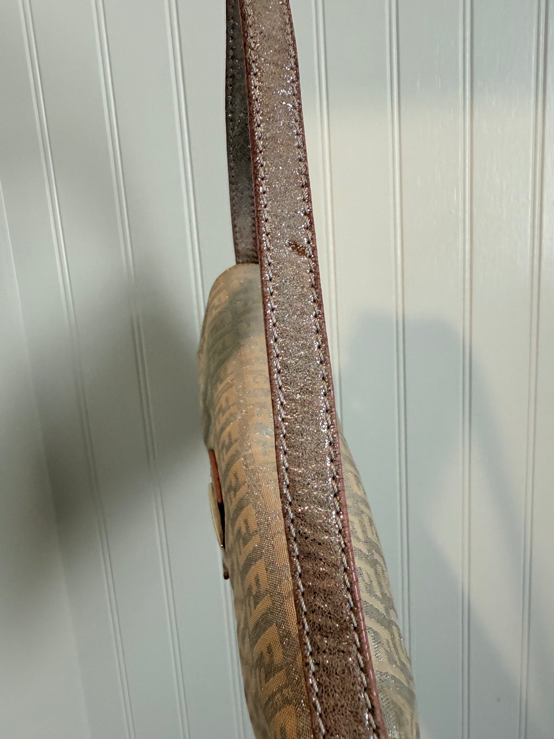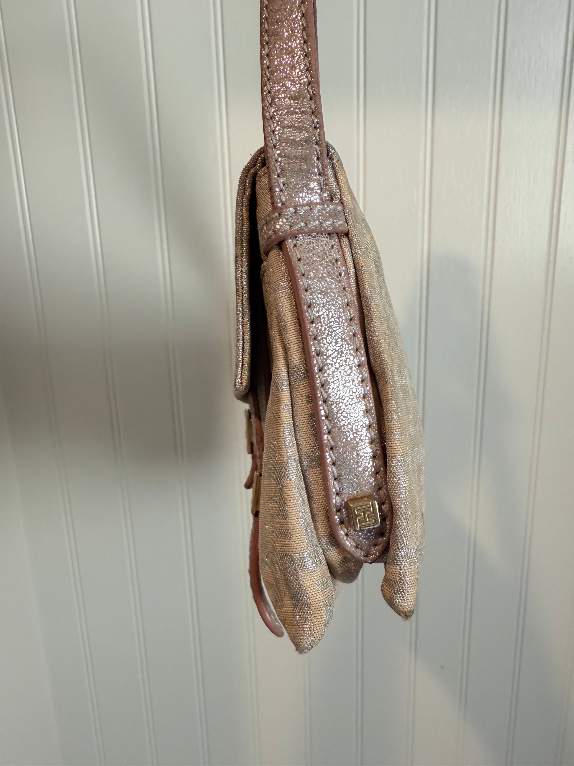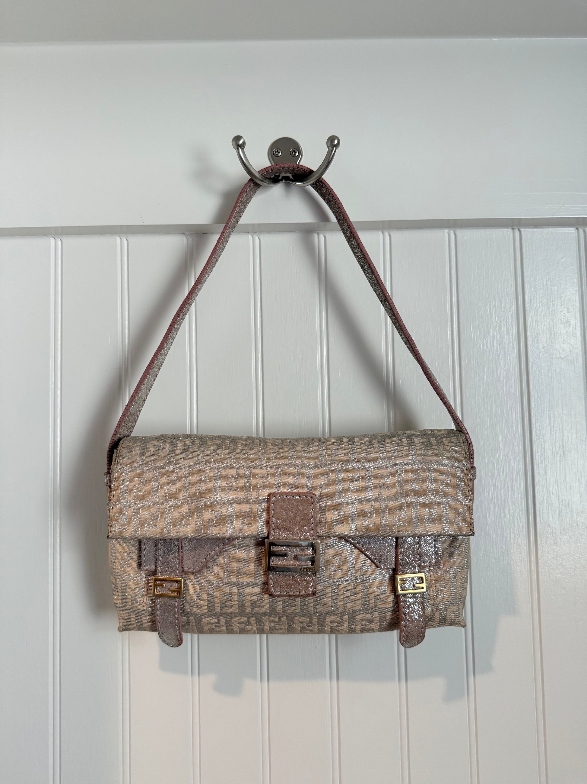 This FENDI shoulder bag is so cute with it's glitter monogram design in pink. IT features a very convienient double pocket, with silver-tone hardware. The inside is pink with a small pocket. Can Fit Phone, card holder, short wallet, lipstick, keys, and other small necessities.