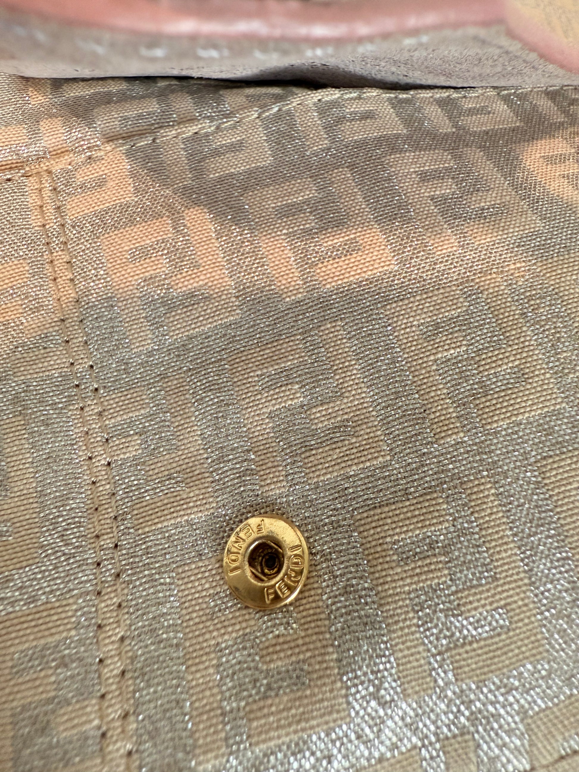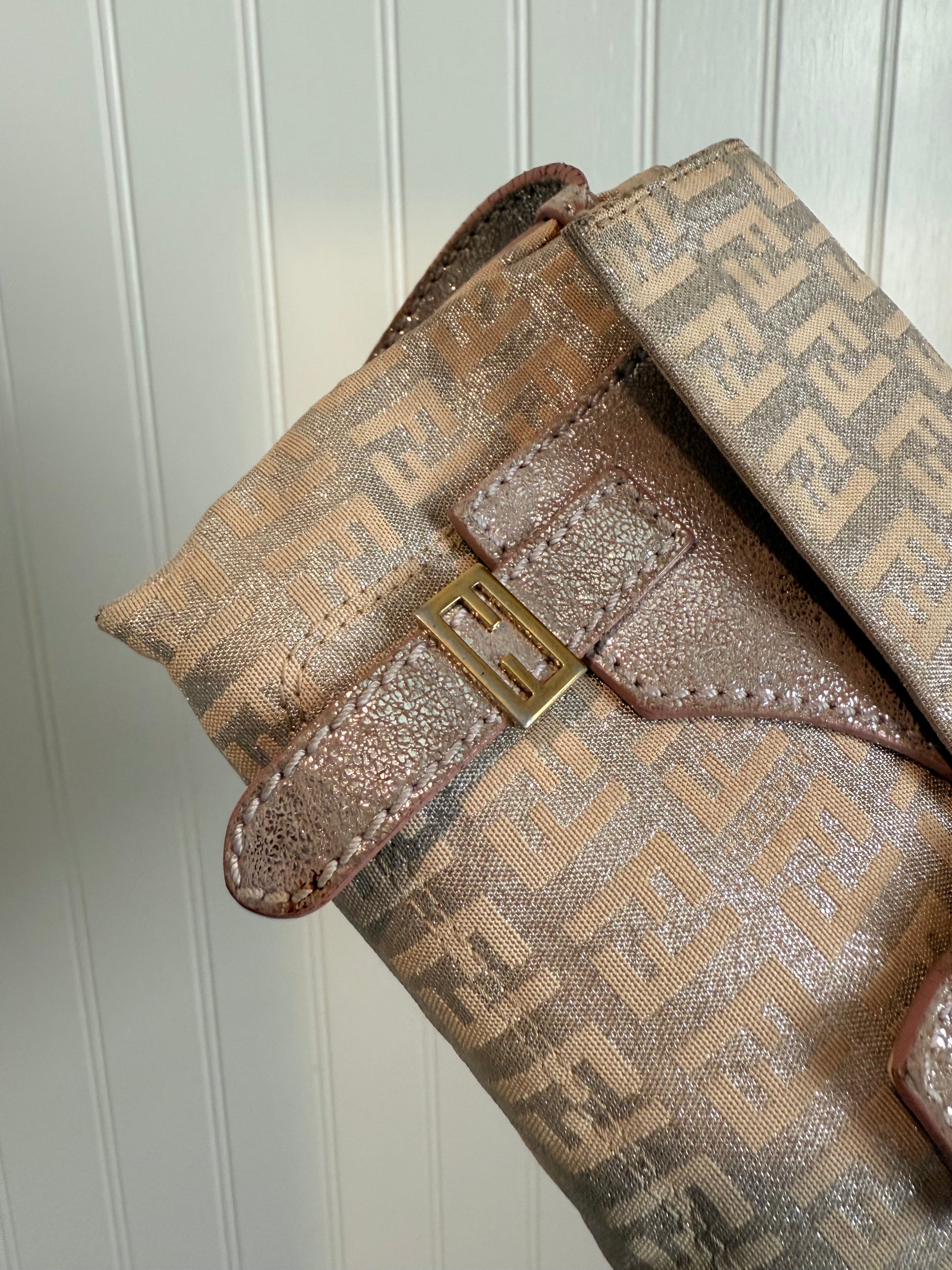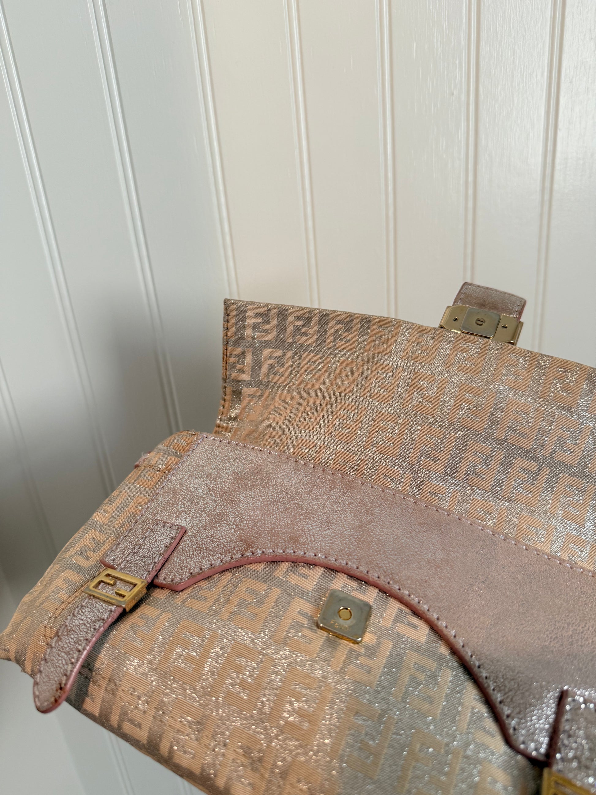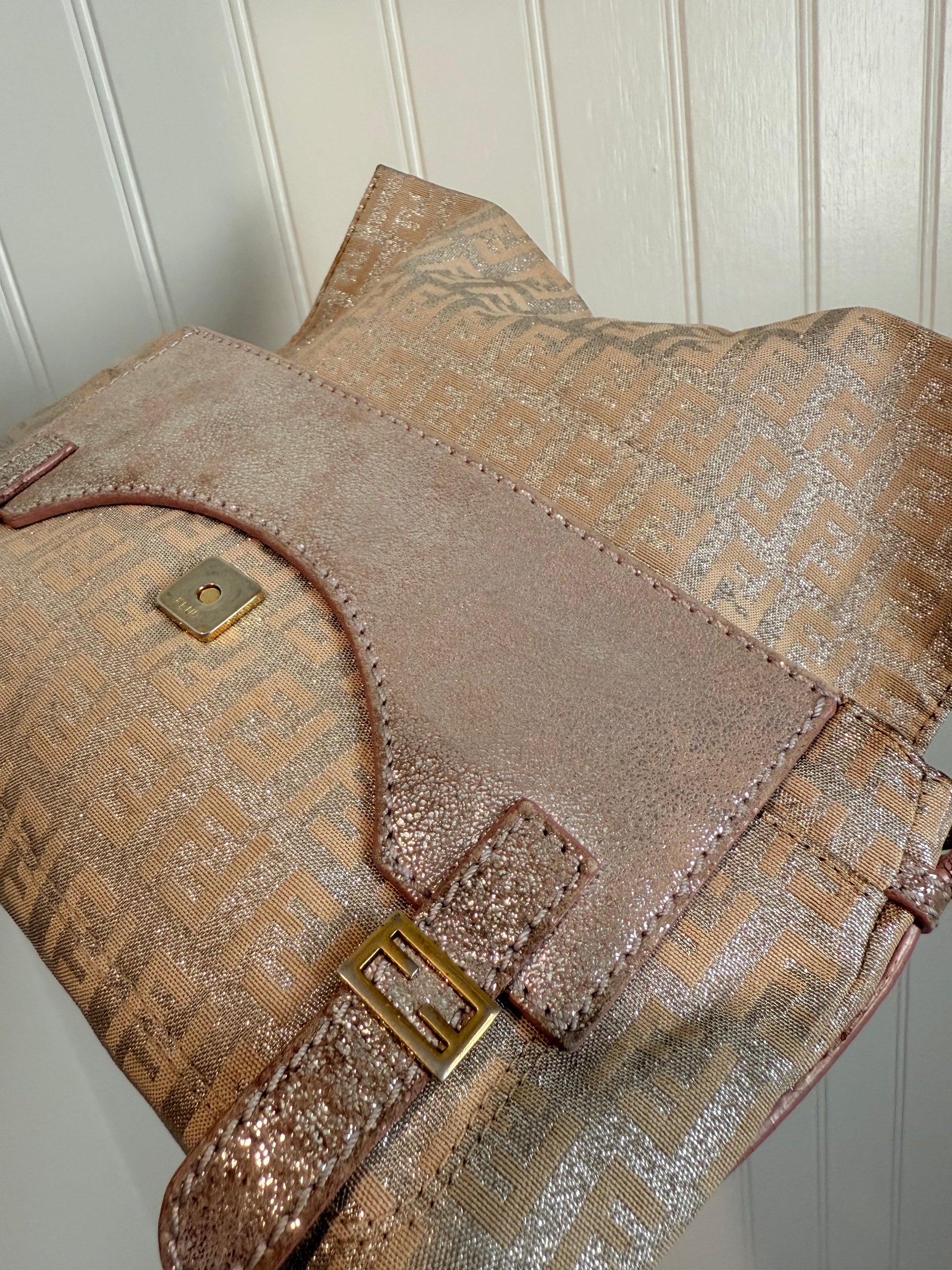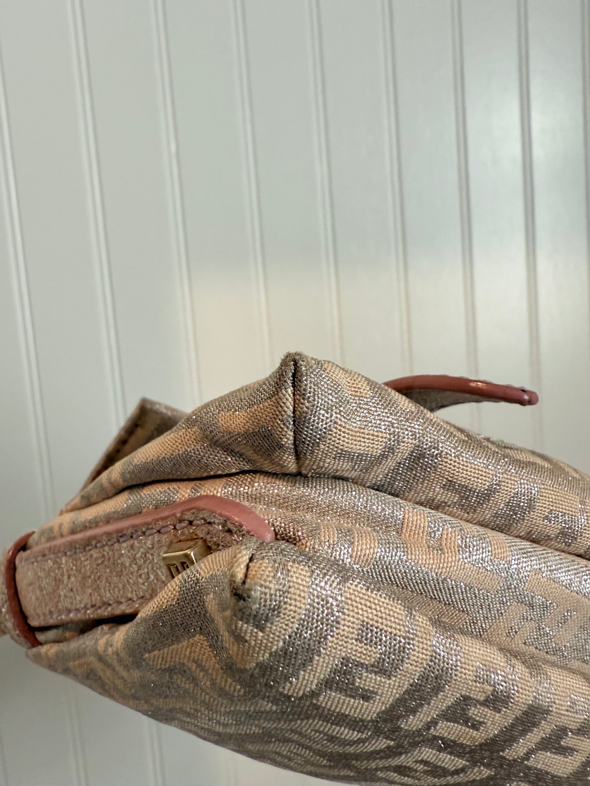This FENDI shoulder bag is so cute with it's glitter monogram design in pink. IT features a very convienient double pocket, with silver-tone hardware. The inside is pink with a small pocket. Can Fit Phone, card holder, short wallet, lipstick, keys, and other small necessities.