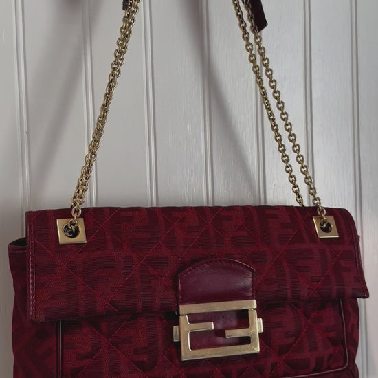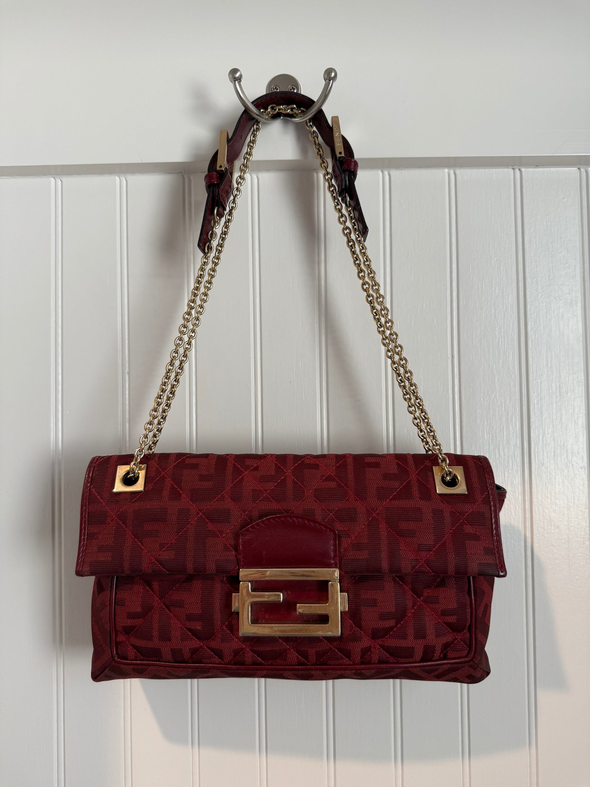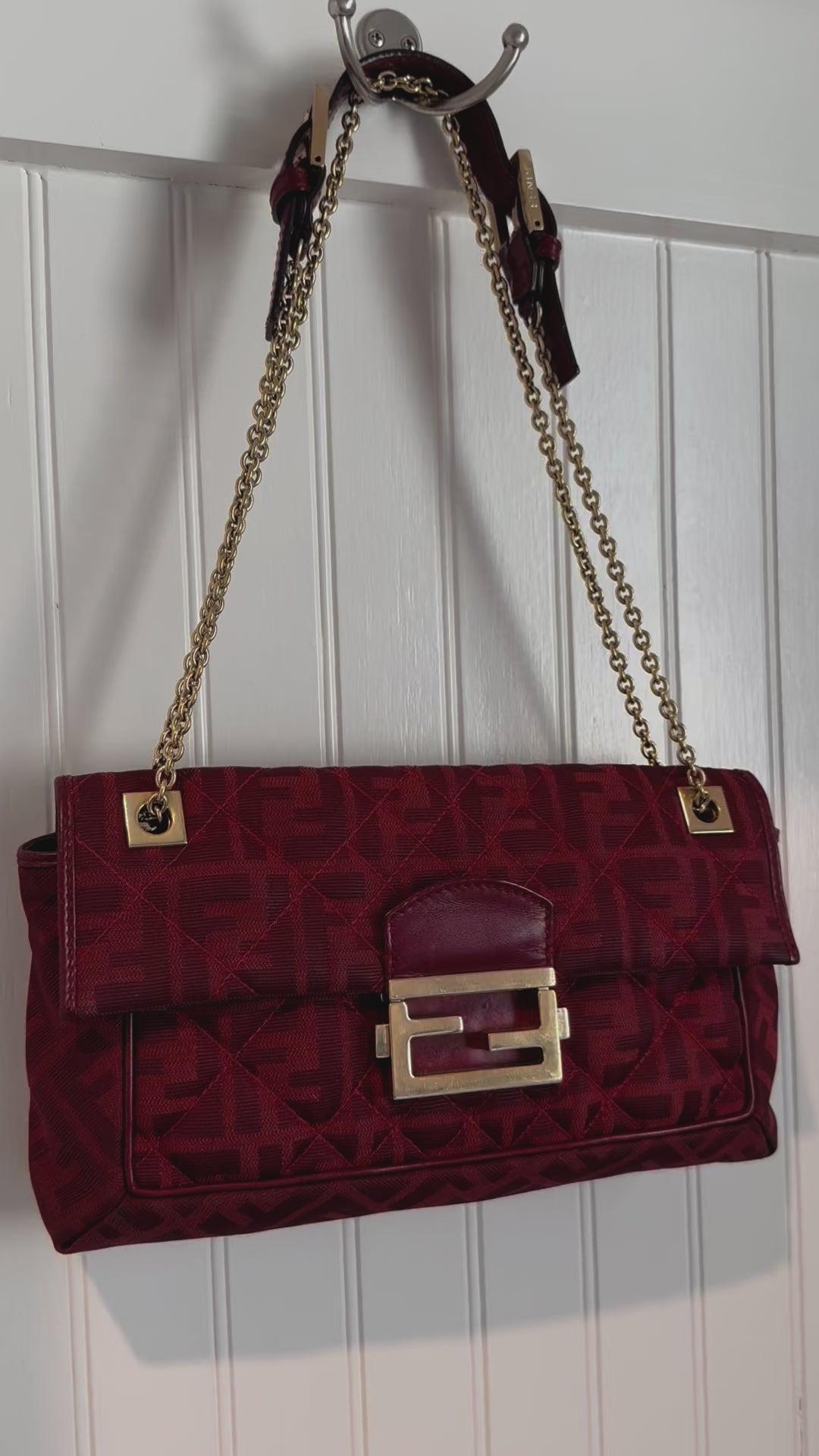 This Fendi red monogram features nylon, with leather and chain strap. This bag can be worn as a shoulder bag or crossbody. This bag features gold-tone hardware. The inside featrures one zipper pocket. This bag also comes with a dustbag. Can Fit Phone, card holder, short wallet, lipstick, keys, and other small necessities