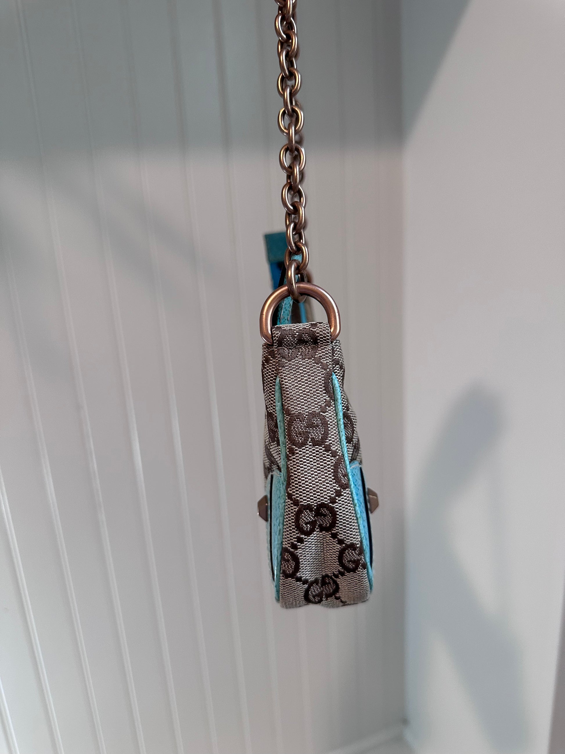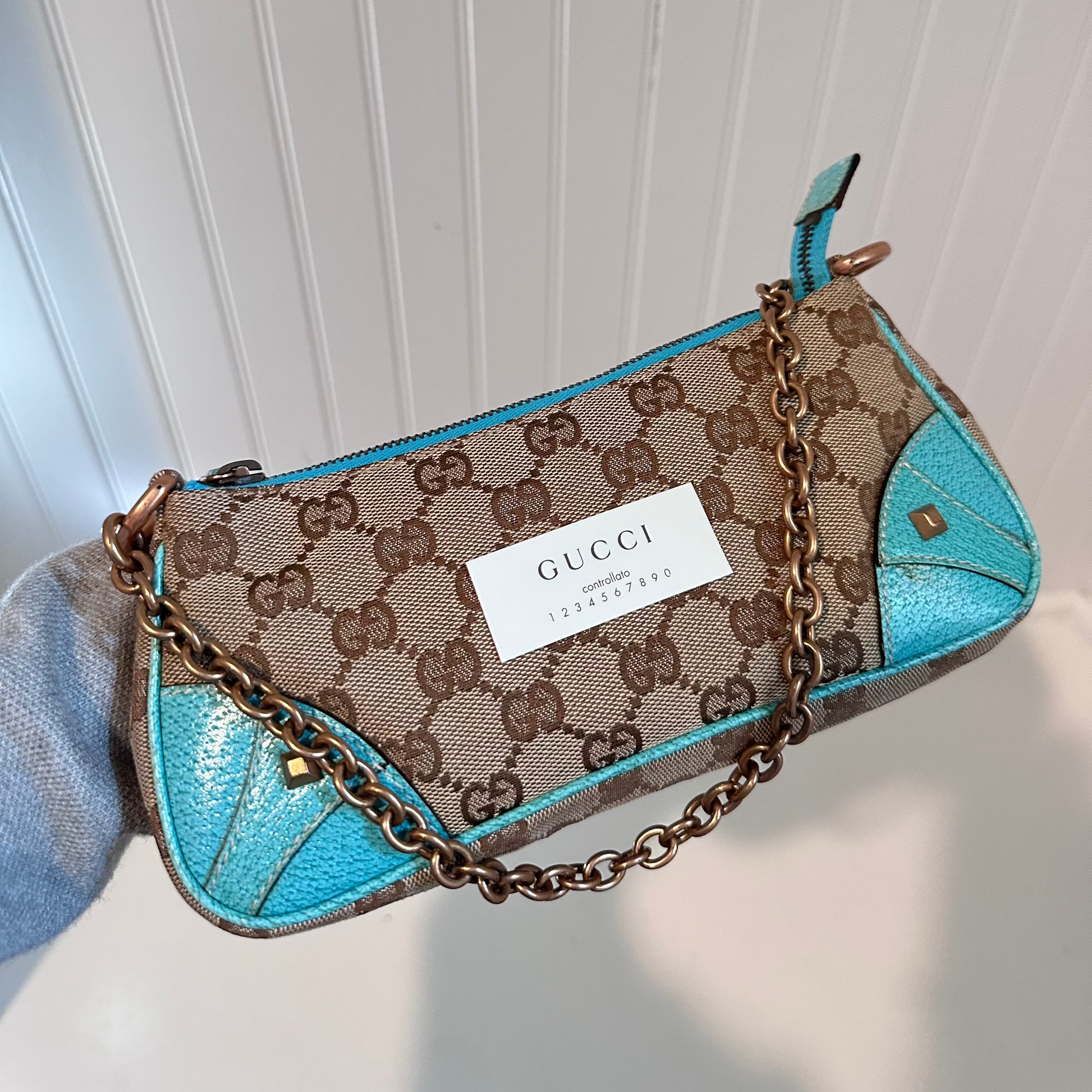 This rare Gucci handbag features a combination of beige canvas and blue leather. Its exterior is adorned with four stud hardware pieces at each corner, while the strap boasts a vintage gold color. Can fit Phone cardholder, keys, Lipstick, and other small necessities. Comes with Gucci dust bag and card.